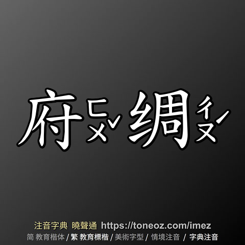 辭典解釋為:府,1.舊時官府儲藏文書或財物的地方。例:書府、祕府、府庫 2.官署,官員辦公的地方。例:官府、首府、縣政府 3.古代介於省、縣間的地方行政機構。例:開封府、徐州府 4.舊時達官顯貴的住所。例:王府、相爺府 5.尊稱別人的家庭或居處。例:尊府、貴府、閤府光臨...