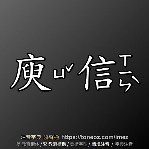 庾信,注音ㄩˇ ㄒㄧㄣˋ,拼音yǔ xìn,辭典解釋為:人名。(西元513~581)字子山,小字蘭成,南朝梁新野人。梁元帝即位,任為右衛將軍,後元帝使出使西魏,值西魏滅梁,信留長安,並任官;北周代魏,信累遷驃騎大將軍、開府儀同三司,在北朝達二十七年,世稱「庾開府」。庾信前期作品,文藻豔麗,與徐陵齊名,時稱「徐庾體」;後期作品,常有鄉關之思,風格一變為沉鬱,語言清新。著有《庾開府集》。