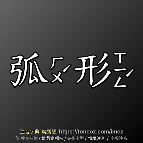 弧形,注音ㄏㄨˊ ㄒㄧㄥˊ,拼音hú xíng,辭典解釋為:彎曲如弓的形狀。例:那棟弧形建築的線條流暢,造型優美。