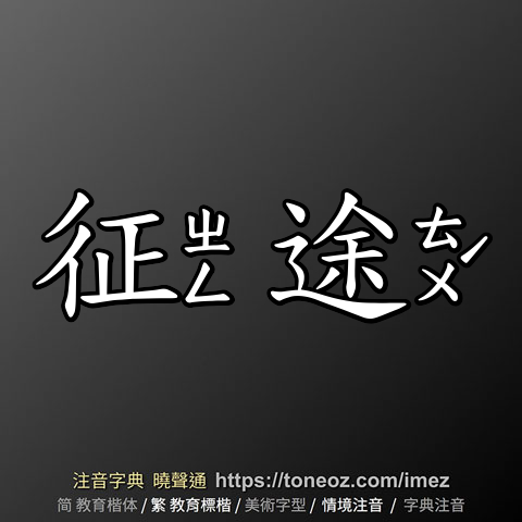 征途,注音ㄓㄥ ㄊㄨˊ,拼音zhēng tú,辭典解釋為:路途、行程。例:他再度收拾行囊,踏上征途,去到遙遠的他鄉。