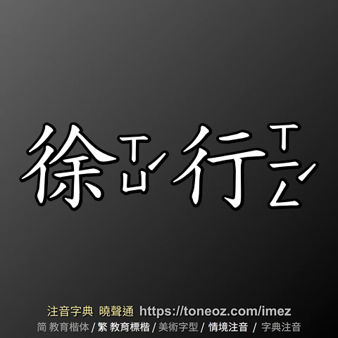 徐行,注音ㄒㄩˊ ㄒㄧㄥˊ,拼音xú xíng,辭典解釋為:緩步而行。《孟子.告子下》:「徐行後長者,謂之弟,……夫徐行者,豈人所不能哉,所不為也。」《西遊記》第三四回:「那把門的小妖,把空轎抬入門裡。他卻隨後徐行。」