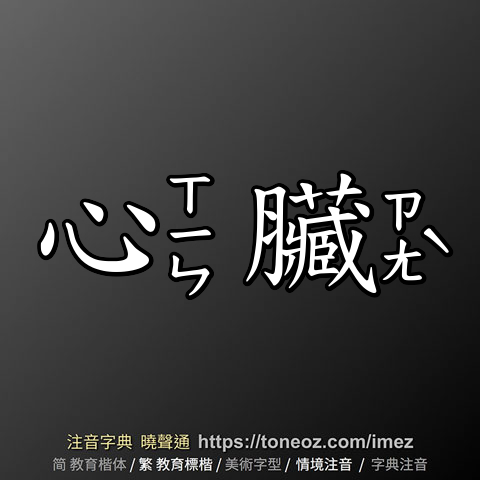 心臟,注音ㄒㄧㄣ ㄗㄤˋ,拼音xīn zàng,辭典解釋為:1.→心 2.比喻最重要的部位。例:這個區域商業發達,人潮集中,是全市的心臟地帶。