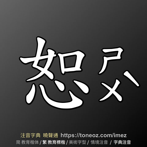 恕,注音ㄕㄨˋ,拼音shù,辭典解釋為:1.推己及人之道。例:忠恕、仁恕 2.寬宥、原諒。例:饒恕、寬恕、恕罪