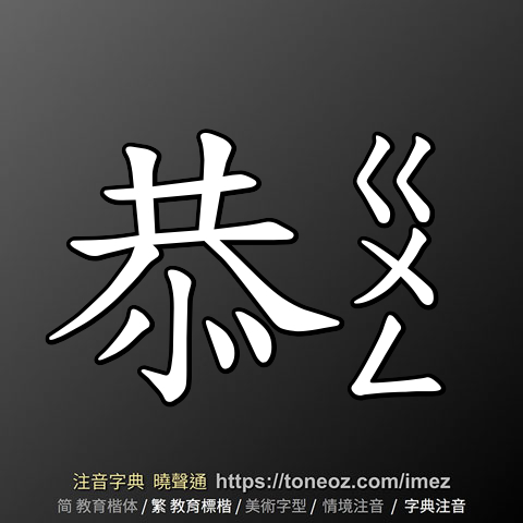 恭,注音ㄍㄨㄥ,拼音gōng,辭典解釋為:1.尊敬。例:恭老卹幼 2.一種拱手致意的禮節。例:打恭作揖 3.態度敬肅、謙和的。例:恭牧、謙恭、洗耳恭聽