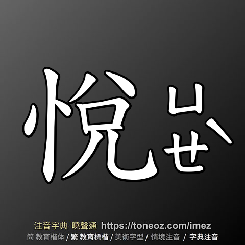 悅,注音ㄩㄝˋ,拼音yuè,辭典解釋為:1.愉快的、高興的。例:和顏悅色、心悅誠服 2.使愉快。例:悅耳、賞心悅目