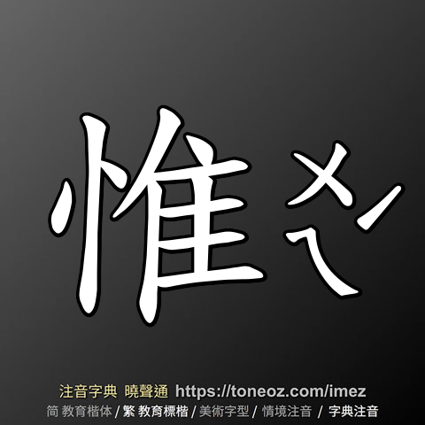 惟,注音ㄨㄟˊ,拼音wéi,辭典解釋為:1.思考、思量。例:思惟、伏惟 2.是、為。例:萬邦黎獻,共惟帝臣。(《書經.益稷》) 3.僅、獨、只有。同「唯」。
