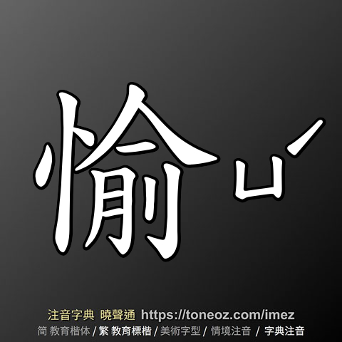 愉,注音ㄩˊ,拼音yú,辭典解釋為:快樂、高興。例:愉快、歡愉