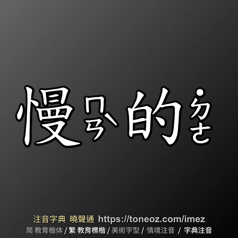 辭典解釋為:慢,1.速度低緩的。與「快」相對。例:慢車、動作很慢  2.稍緩。例:且慢生氣,先聽聽他怎麼說。 3.態度冷漠、不禮貌的。例:傲慢、輕慢、怠慢 4.宋詞的體制。長調稱為「慢」,以調子長、聲音緩慢而得名。如聲聲慢、揚州慢、木蘭花慢...