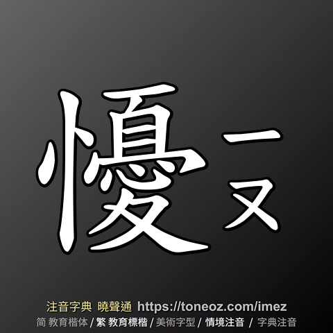 懮,注音ㄧㄡˇ,拼音yǒu,辭典解釋為:[形] 懮受:從容悠閒的樣子。《玉篇.心部》:「懮,懮受,舒遲之貌。」《詩經.陳風.月出》:「舒懮受兮,勞心慅兮。」