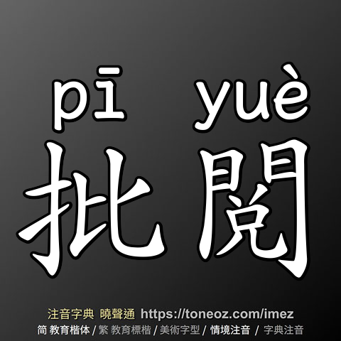 批閱,注音ㄆㄧ ㄩㄝˋ,拼音pī yuè,辭典解釋為:閱讀並加以批示。例:加了二小時的班,他終於將一大堆的公文批閱完畢。