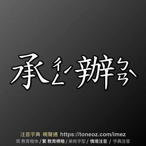 承辦,注音ㄔㄥˊ ㄅㄢˋ,拼音chéng bàn,辭典解釋為:接受辦理。例:這件事是由李小姐承辦的,有任何問題可以直接找她。