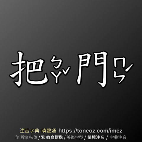 把門,注音ㄅㄚˇ ㄇㄣˊ,拼音bǎ mén,辭典解釋為:守門。例:這次任務,由他負責把門。
