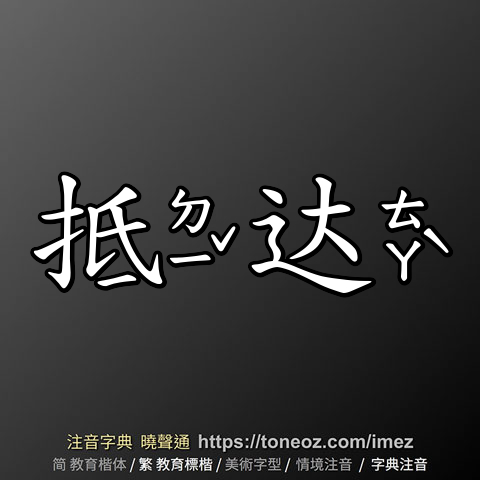 辭典解釋為:抵,1.頂、支撐。例:抵著、抵住 2.擋、抗拒。例:抵抗、抵擋 3.衝突、觸犯。例:抵觸 4.價值相當,可互相頂換。例:抵債、抵命、抵償 5.互相消除。例:抵消、收支相抵 6.到達。例:抵達、安抵家門...