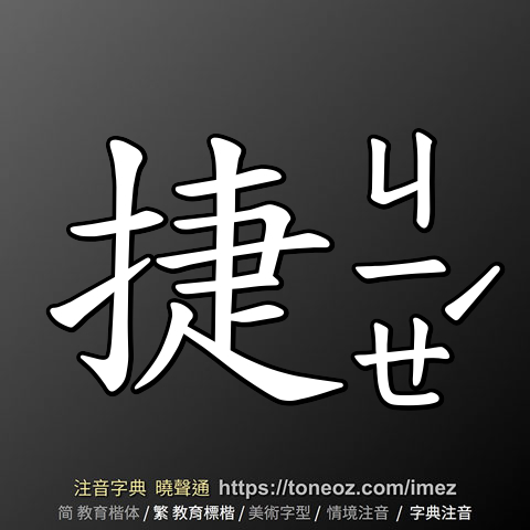 捷,注音ㄐㄧㄝˊ,拼音jié,辭典解釋為:1.快速、迅速。例:迅捷、敏捷、捷足先登 2.戰勝、勝利。例:大捷、每戰皆捷
