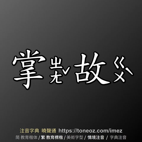 掌故,注音ㄓㄤˇ ㄍㄨˋ,拼音zhǎng gù,辭典解釋為:故事、史實、慣例。即典章制度或故事傳說。例:李教授學博識廣,對於古典文學中各個掌故都知之甚詳。