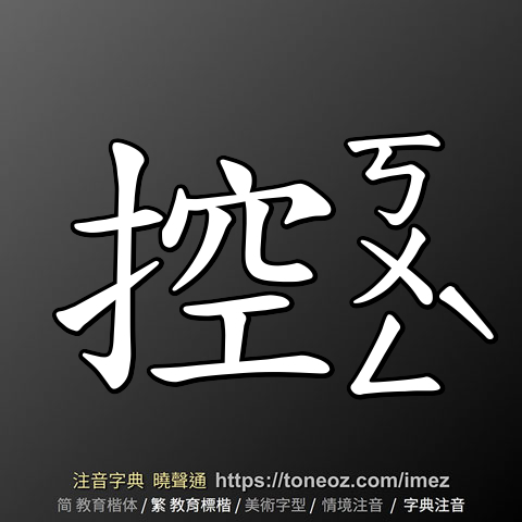 控,注音ㄎㄨㄥˋ,拼音kòng,辭典解釋為:1.操縱、支配。例:控制、遙控、操控 2.投訴、告發。例:指控、誣控、控訴