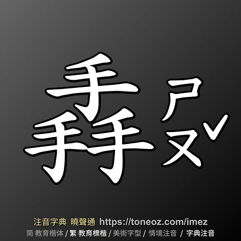 掱,注音ㄕㄡˇ,拼音shǒu,辭典解釋為:[名] 扒手。清.徐珂《清稗類鈔.盜賊類.掱手》:「滬人呼翦綹賊曰掱手,猶言扒手也,亦曰癟三碼子。」