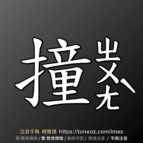 撞,注音ㄓㄨㄤˋ,拼音zhuàng,辭典解釋為:1.敲打。例:撞鐘 2.行進間猛然碰觸某物體。例:撞車、衝撞、撞傷  3.碰巧遇上。例:撞見、擇期不如撞期 4.衝突。例:頂撞