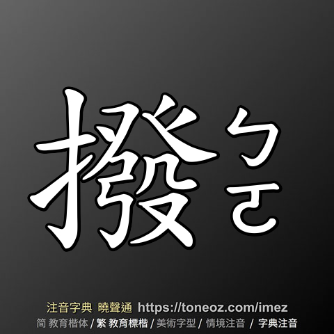 撥,注音ㄅㄛ,拼音bō,辭典解釋為:1.橫向推開或排除。例:撥草、撥雲見日  2.用手轉動、挑動或拉動。例:撥鐘、撥弦 3.提出部分發放。例:本公司打算撥一筆基金給孤兒院。 4.扭轉。例:撥亂反正 5.量詞。計算成批或分組人群的單位。例:有一撥人馬剛打這裡經過。