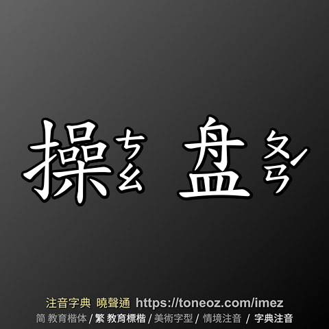 辭典解釋為:操,1.持、拿。例:操刀 2.掌握。例:穩操勝算 3.從事。例:重操舊業 4.訓練、鍛鍊。例:操兵演練、軍事操演 5.使用某種語言或口音說話。例:操北方口音 6.品格、德行。例:節操、操守、操行 7.一種鍛鍊筋骨的運動。例:體操、早操、健美操...
