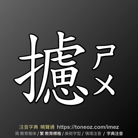 攄,注音ㄕㄨ,拼音shū,辭典解釋為:[動] 1.抒發、發表。《文選.班固.西都賦》:「願賓攄懷舊之蓄念,發思古之幽情。」唐.白居易〈讀謝靈運〉詩:「豈惟玩景物,亦欲攄心素。」 2.流傳。唐.張說〈唐西臺舍人贈泗洲刺史徐府君碑〉:「迺刊石立頌,將以識往行,攄無窮,使本支百代,不忘先人之不隕其名也。」 3.騰躍。《後漢書.卷五九.張衡傳》:「僕夫儼其正策兮,八乘攄而超驤。」