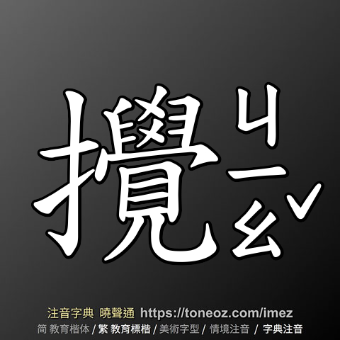 攪,注音ㄐㄧㄠˇ,拼音jiǎo,辭典解釋為:1.擾亂。例:打攪、胡攪蠻纏 2.用手或器具將液體、粉末等調勻。例:攪和、攪拌  3.攙雜、混合。例:請不要把公事和私人恩怨攪在一起。