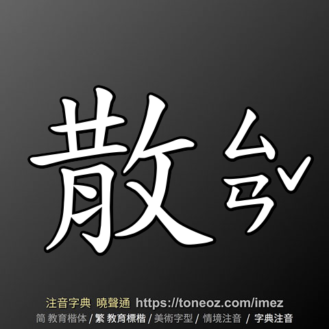 散,注音ㄙㄢˋ,拼音sàn,辭典解釋為:1.由聚集狀態分離、分開。與「聚」相對。例:分散、離散、煙消雲散 2.放出、撒出。例:散播、散發、天女散花 3.排遣、抒發。例:散悶、散心