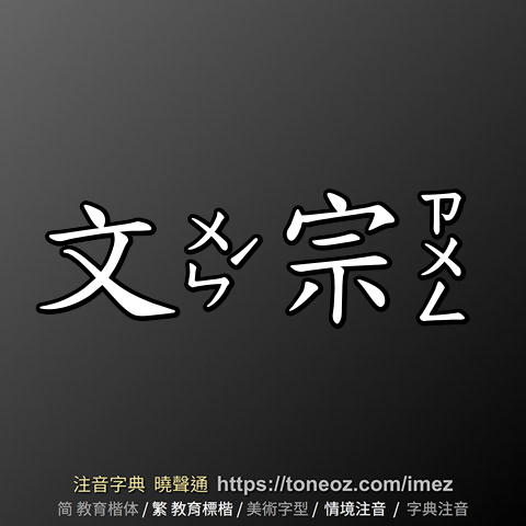文宗,注音ㄨㄣˊ ㄗㄨㄥ,拼音wén zōng,辭典解釋為:1.以文學成就而為人敬仰的人。《晉書.卷五四.陸雲傳》:「百代文宗,一人而已。」 2.清代學政的別稱。參見「學政」條。《聊齋志異.卷一一.書痴》:「每文宗臨試,輒首拔之,而苦不得售。」
