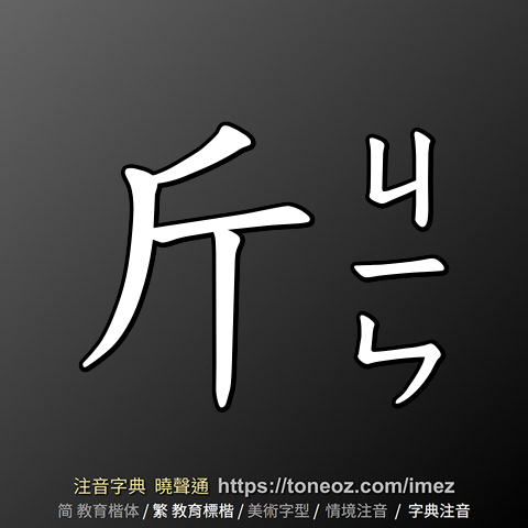 斤,注音ㄐㄧㄣ,拼音jīn,辭典解釋為:1.一種砍樹用的斧頭。例:斧斤以時入山林,材木不可勝用也。(《孟子.梁惠王上》) 2.量詞。計算重量的單位。1公斤等於1000公克;1臺斤等於600公克;1市斤等於500公克。