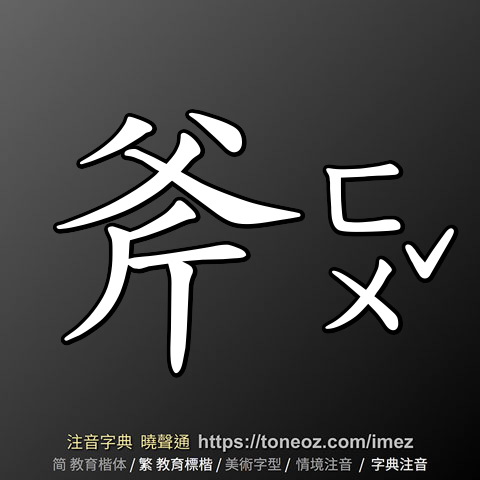 斧,注音ㄈㄨˇ,拼音fǔ,辭典解釋為:用來砍伐的工具。例:斧頭、刀斧
