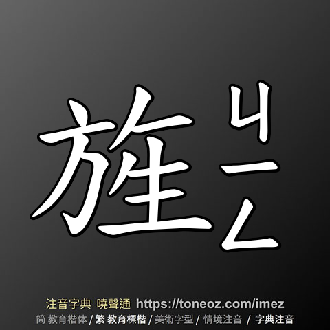旌,注音ㄐㄧㄥ,拼音jīng,辭典解釋為:1.古代一種裝飾著五彩羽毛的旗子。例:旌旗、霓旌 2.表揚、表彰。例:旌表、以旌其功