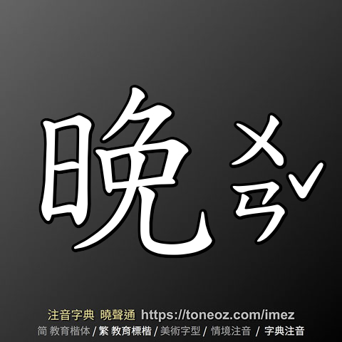 晚,注音ㄨㄢˇ,拼音wǎn,辭典解釋為:1.黃昏、日落時分。與「早」相對。例:晚霞、從早到晚 2.夜間。例:晚間、昨晚、晚上 3.晚間的。例:晚飯、晚課 4.將盡的、末期的。例:晚年、晚歲 5.遲。例:大器晚成、相見恨晚 6.繼任的、後來的。例:晚娘、晚輩