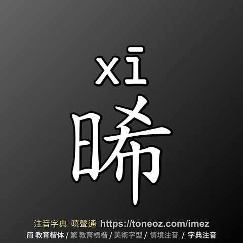 晞,注音ㄒㄧ,拼音xī,辭典解釋為:1.蒸發、消散。例:兼葭萋萋,白露未晞。(《詩經.秦風.蒹葭》) 2.破曉、露出曙光。例:東方未晞 3.晒、弄乾。例:晞髮