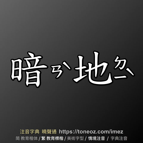 暗地,注音ㄢˋ ㄉㄧˋ,拼音àn dì,辭典解釋為:偷偷的、私下。例:他的自尊心很強,不肯接受幫助,我只好暗地裡接濟他。