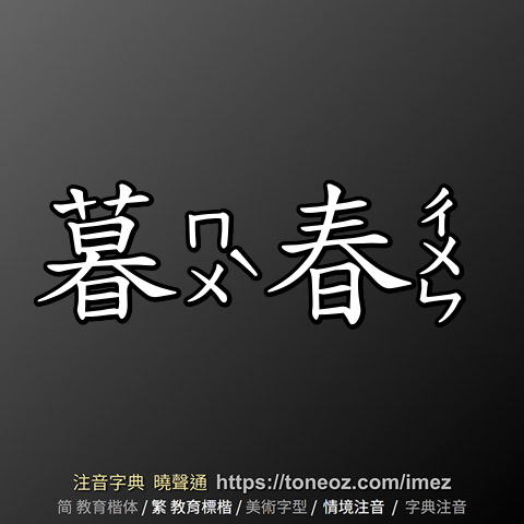 暮春,注音ㄇㄨˋ ㄔㄨㄣ,拼音mù chūn,辭典解釋為:陰曆三月,春季的末期。晉.王羲之〈蘭亭集序〉:「永和九年,歲在癸丑,暮春之初,會于會稽山陰之蘭亭,修禊事也。」《西遊記》第九回:「正是暮春天氣,和風吹柳綠,細雨點花紅。」也稱為「莫春」、「季春」、「晚春」。