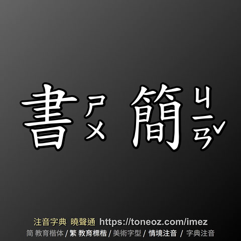 書簡,注音ㄕㄨ ㄐㄧㄢˇ,拼音shū jiǎn,辭典解釋為:書信。《三國志.卷六三.吳書.趙達傳》:「又有書簡上作千萬數,著空倉中封之,令達算之。」《宋史.卷三一○.王曾傳》:「平生自奉甚儉,有故人子孫京來告別,曾留之具饌,食後,合中送數軸簡紙,啟視之,皆它人書簡後裁取者也。」也作「書柬」。