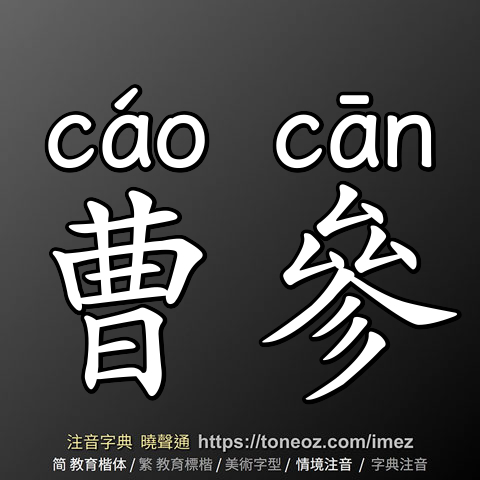 曹參,注音ㄘㄠˊ ㄘㄢ,拼音cáo cān,辭典解釋為:人名。(西元?~前190)字敬伯,漢初沛人。與蕭何同佐高祖定天下,封平陽侯,繼蕭何為相,一遵蕭規。卒諡懿。