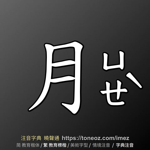 月,注音ㄩㄝˋ,拼音yuè,辭典解釋為:1.月亮、月球。例:新月、月光、月暈 2.時間單位。是月球繞行地球一周所需的時間。十二個月為一年。 3.每個月的。例:月會、月刊、月薪 4.圓形像月亮的。例:月餅、月琴 5.量詞。計算時間的單位。一年有十二個月。例:這個企劃案花了數月時間才完成。