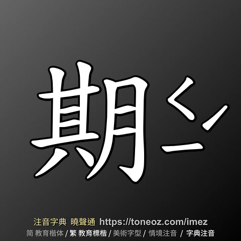 期,注音ㄐㄧ,拼音jī,辭典解釋為:1.周年。例:期年 2.喪服中期服的簡稱。例:外無期功彊近之親,內無應門五尺之僮。(《文選.李密.陳情表》)