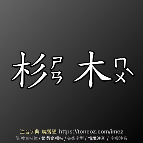 杉木,注音ㄕㄢ ㄇㄨˋ,拼音shān mù,辭典解釋為:植物名。杉科杉木屬,常綠大喬木。樹幹挺直,樹皮縱裂,外皮呈棕褐色,內皮為赤色。葉旋生而扭成二列,螺旋狀著生,線狀披針形,邊緣有細鋸齒。花單性,雌雄同株。果實為卵圓形毬果,有短柄,種子下垂。材質堅硬細緻,可供建築和製造器具,亦可製作棺木。例:高山地區普遍可栽植耐寒的杉木。