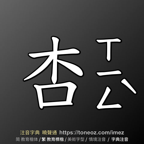 杏,注音ㄒㄧㄥˋ,拼音xìng,辭典解釋為:植物名。薔薇科櫻屬,落葉喬木。樹皮帶赤色。三月開淡紅色花朵,花、葉像梅,果實扁圓、肥厚,味稍酸。核裡有仁,可食亦可入藥。花與果實亦稱為「杏」。例:杏仁、杏花