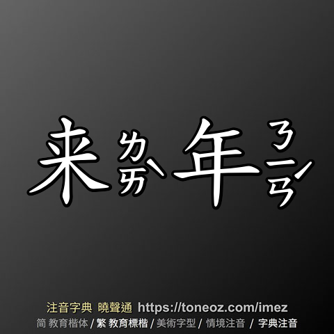 辭典解釋為:年,1.量詞。計算時間的單位。一年有十二個月。例:這件事要花四年時間才能完成。 2.年節。例:過年 3.時代、時期。例:滿清末年、康熙年間 4.歲數、年齡。例:延年益壽、年輕力壯 5.人生中的某時期。例:童年、壯年、老年 6.農作物收成的情形。例:豐年、歉年...
