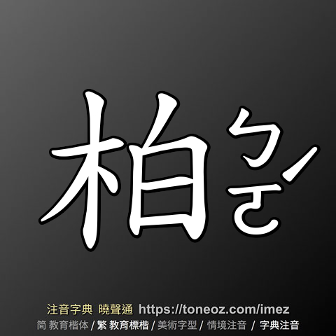 柏,注音ㄅㄛˊ,拼音bó,辭典解釋為:1.柏科植物的總稱。常綠喬木。性耐寒,葉小、鱗形,木質紋理細密,是上好材質。有扁柏、側柏、檜柏、羅漢柏等數種。例:松柏長青  2.姓。