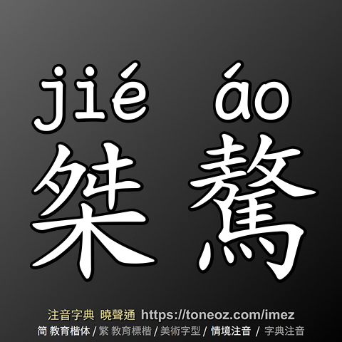 桀驁,注音ㄐㄧㄝˊ ㄠˊ,拼音jié áo,辭典解釋為:凶悍狂妄。例:他的個性叛逆桀驁,時常與人發生衝突。