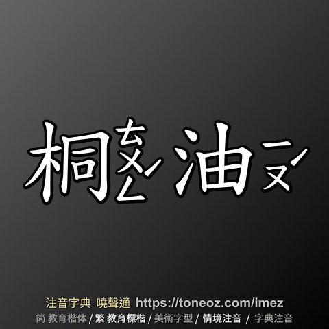 桐油,注音ㄊㄨㄥˊ ㄧㄡˊ,拼音tóng yóu,辭典解釋為:油桐子所製成的油。用途很廣,可以塗飾房屋和器具,製造油漆、油墨、油布,並可用作防水、防腐劑等。例:過去的紙傘上都塗了一層桐油以防雨。
