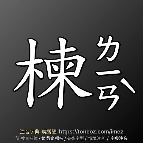 楝,注音ㄌㄧㄢˋ,拼音liàn,辭典解釋為:植物名。楝科楝屬,落葉喬木。羽狀複葉,小葉呈卵形或披針形,花軸、花梗及花萼皆布有細毛。果實呈核果狀,種子稱為「金鈴子」,呈長橢圓形,可供藥用。