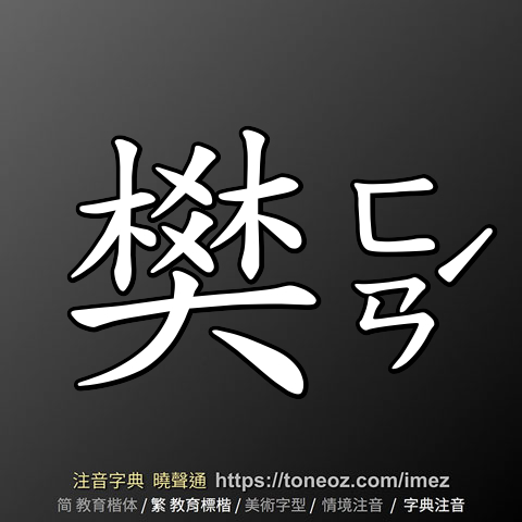 樊,注音ㄈㄢˊ,拼音fán,辭典解釋為:1.關鳥獸的籠子。例:樊籠 2.籬笆。通「藩」。例:樊籬 3.姓。