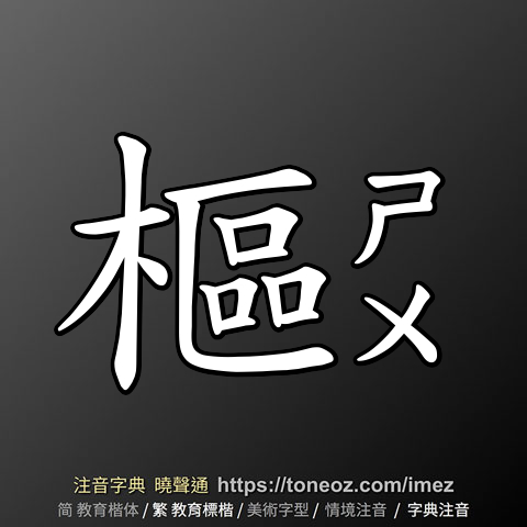 樞,注音ㄕㄨ,拼音shū,辭典解釋為:1.門戶的轉軸。例:戶樞 2.中心部分、重要關鍵。例:中樞、道樞