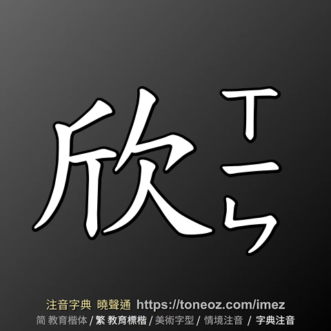 欣,注音ㄒㄧㄣ,拼音xīn,辭典解釋為:喜悅、歡樂。例:歡欣、欣喜、欣慰