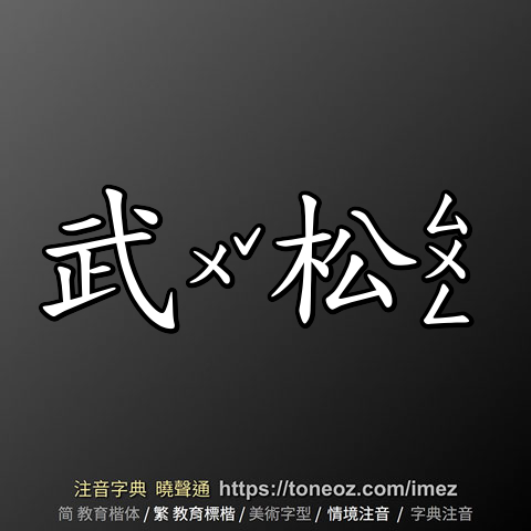 武松,注音ㄨˇ ㄙㄨㄥ,拼音wǔ sōng,辭典解釋為:水滸傳小說中的人物。勇武有力,曾路經景陽崗,徒手打死猛虎,被視為英雄好漢的典型。